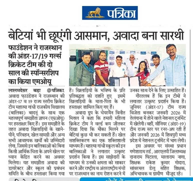 The Foundation has signed a Memorandum of Understanding (MoU) in november 2025  to support and sponsor the Rajasthan state-level Under-17 and Under-19 girls’ cricket teams from Mahatma Gandhi Government School, Badnu (Bikaner) for the next two years. Having already supported these teams over the past year, this formal partnership strengthens a shared commitment to talent, discipline, and dreams.